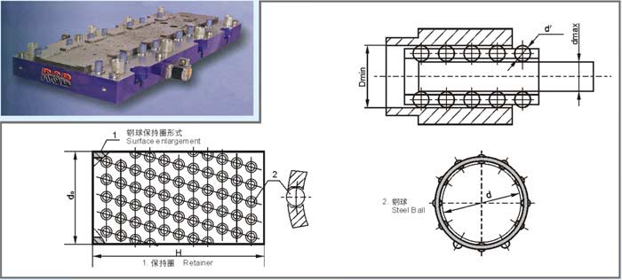 传统的具有相对运动的孔与轴是有一定间隙的,并孔与轴之间运动磨擦系数较大,使用钢球保持圈后,使轴与孔不直接接触,而是中间通过有微量过盈的钢球,因而运动精度高,滚动摩擦代替了滑动摩擦,滚动灵活,摩擦系数小,使用寿命长,在既有转动、又有移动的场合,用无油或加油的轴套与轴相配,虽然能满足,但运动精度较低,用滚动轴承,只能满足轴相对转动的场合,而钢球保持圈,则上述二个条件均满足,目前已广泛应用于冷冲模滚动模架、高精度机床、机床附件以及要求高精度轴向或轴径向同时运动场合。